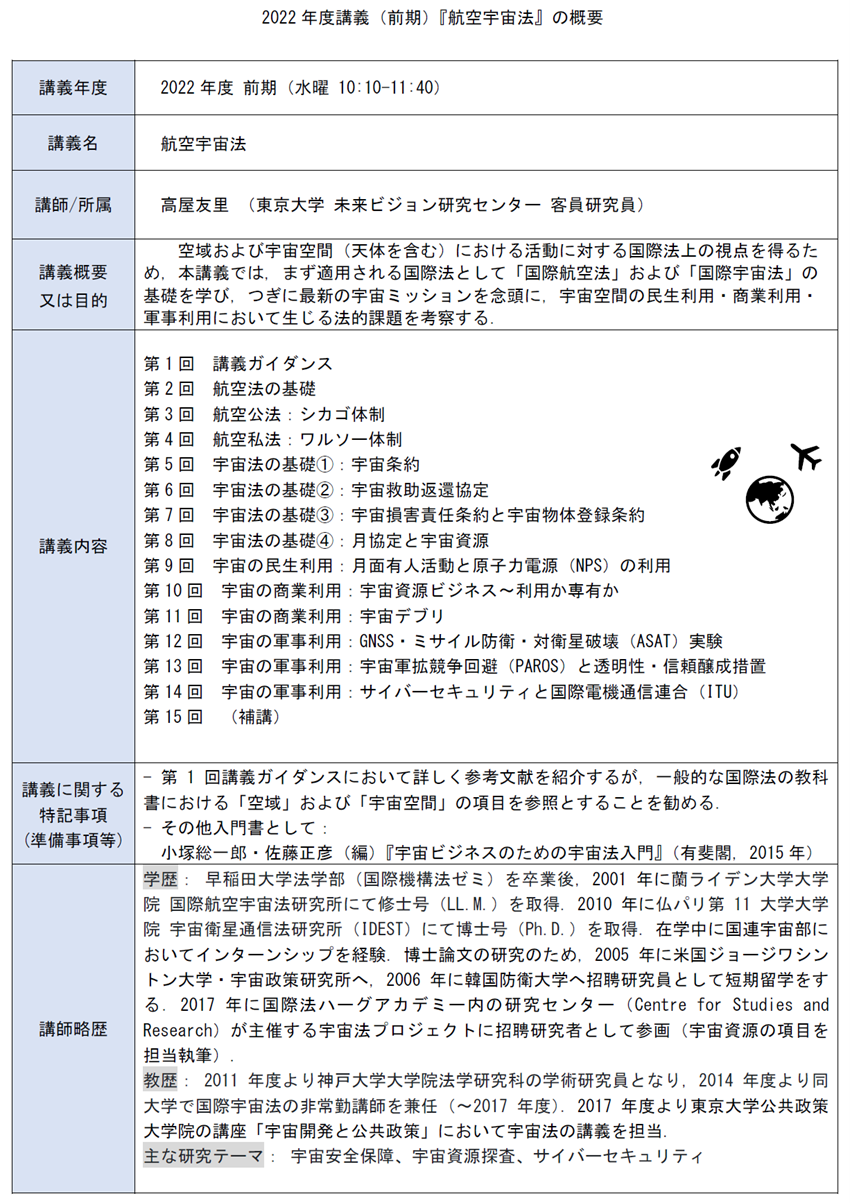 防衛大学校 2022年度前期 航空宇宙法 授業日程と配布資料2022 Schedule (Oct.-Feb.)
